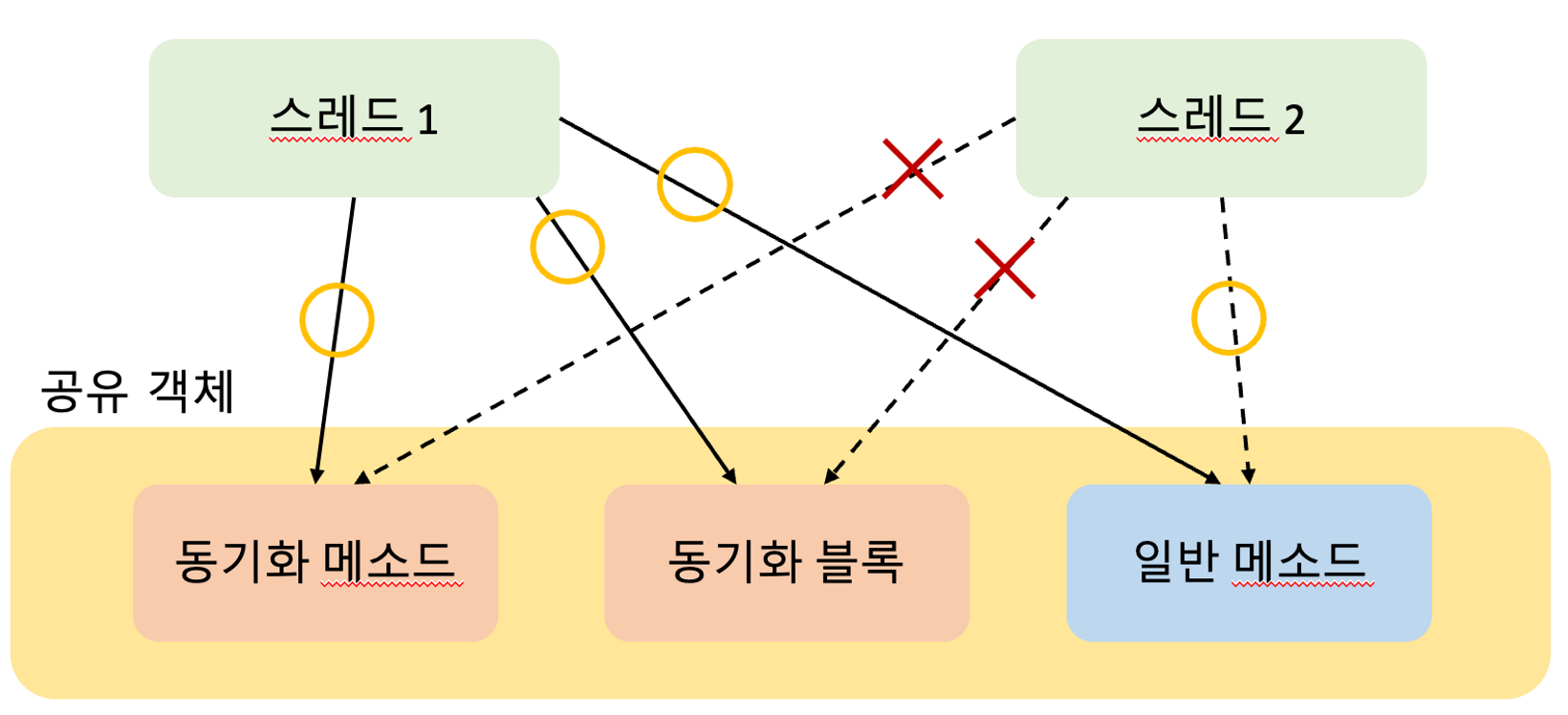 - ๋ฉํฐ ์ค๋ ๋์์ ํน์ ๋ฉ์๋๋ ๋ธ๋ก{}์ ๋ํด lock(์ ๊ธ)์ ์ค์ ํ๋ ๊ฒ