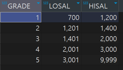 ๐ธ ์๋ฅผ ๋ค์ด..์ฌ์๋ค์ ๊ธ์ฌ ๋ฑ๊ธ์ ํ์ํ๊ธฐ ์ํด์๋ SAL๊ณผ SALGRADE๊ฐ ์ผ์นํ ์ ์์ผ๋ฏ๋ก (์๋ ํ ์ด๋ธ ์ฐธ์กฐ)