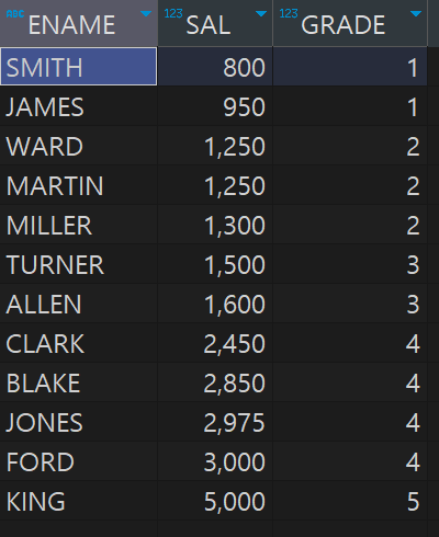SELECT ENAME, SAL, GRADE