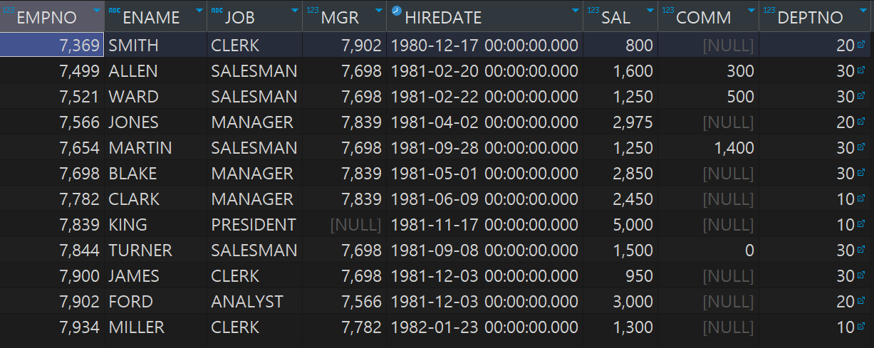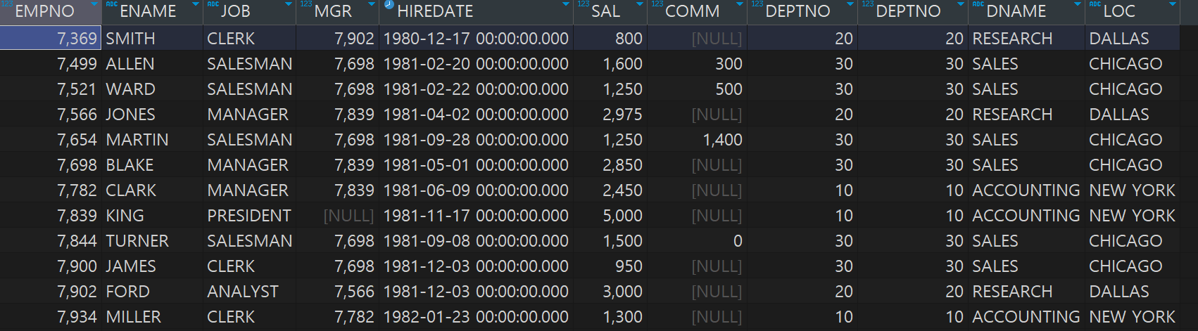 SELECT EMPNO, ENAME, JOB, MGR, HIREDATE, SAL, COMM, DEPTNO, DNAME, LOC