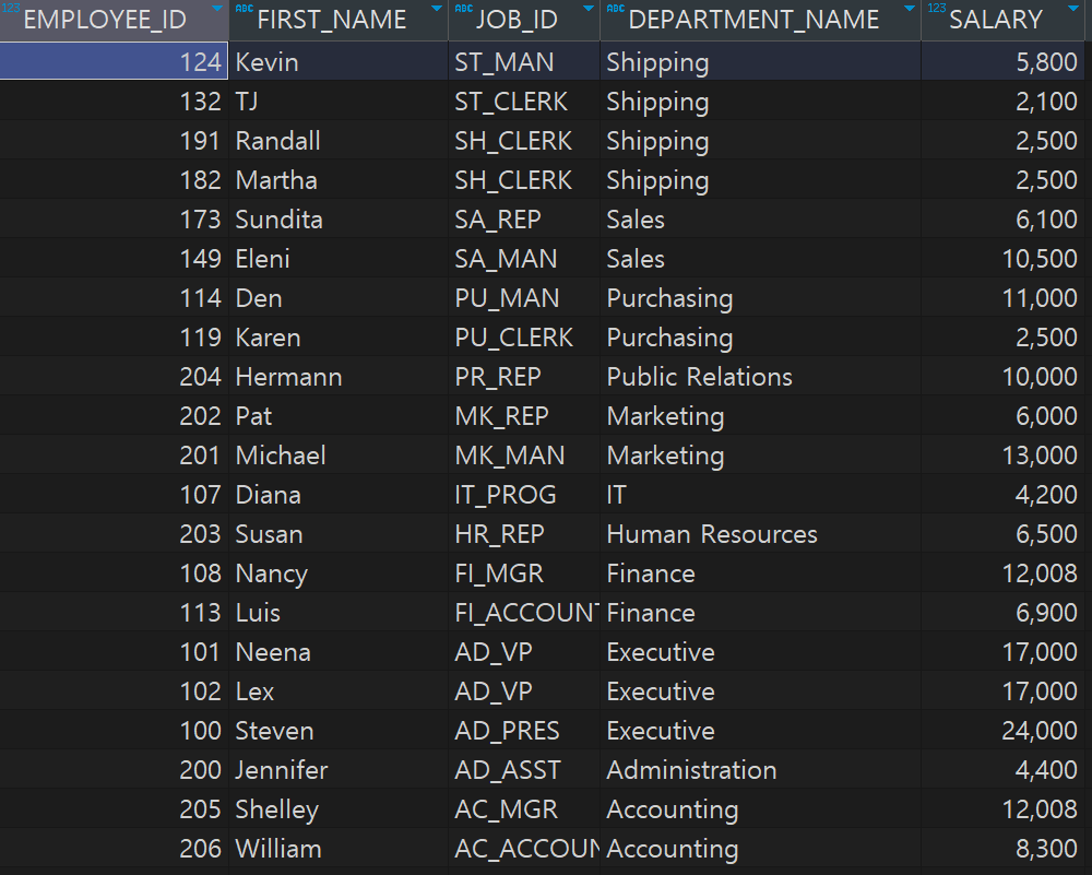 SELECT EMPLOYEE_ID, FIRST_NAME, JOB_ID, DEPARTMENT_NAME, SALARY