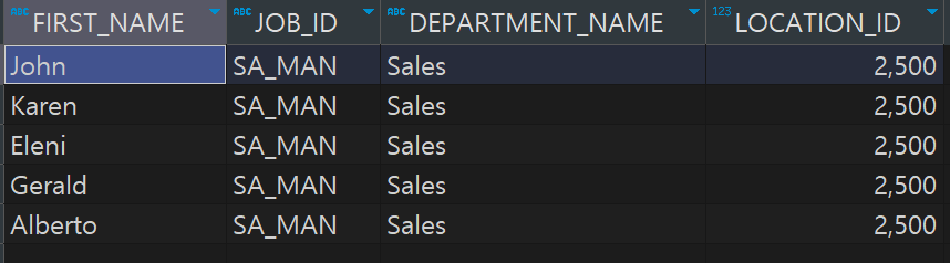 SELECT FIRST_NAME, JOB_ID, DEPARTMENT_NAME, LOCATION_ID