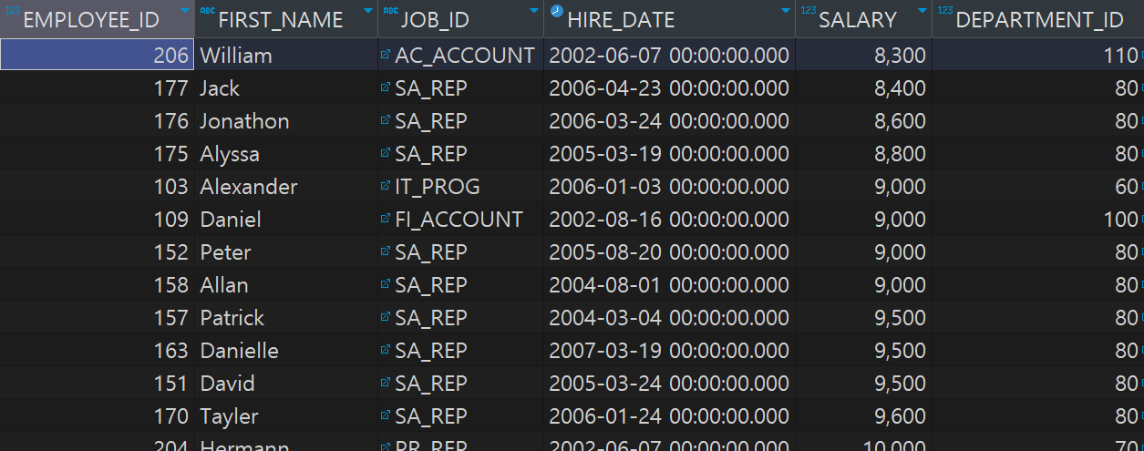 SELECT EMPLOYEE_ID, FIRST_NAME, JOB_ID, HIRE_DATE, SALARY, DEPARTMENT_ID