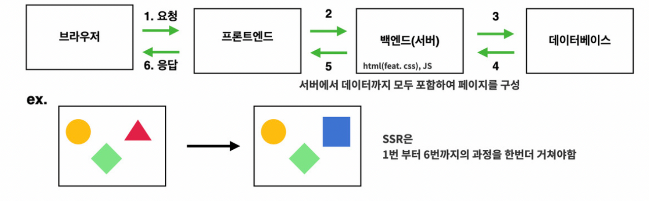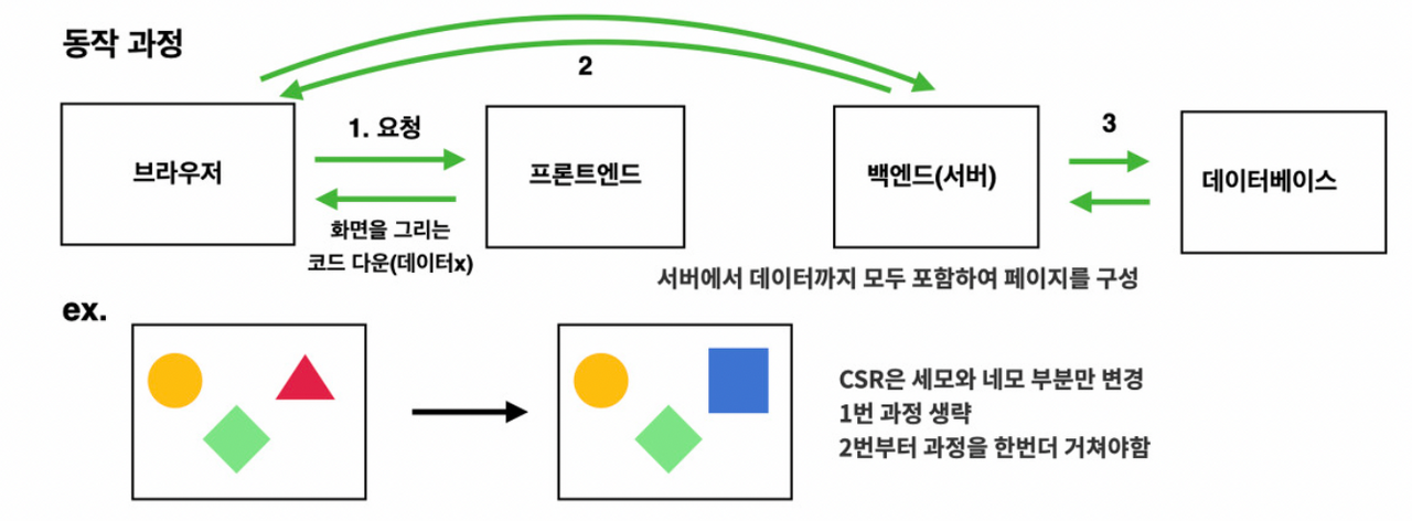 - ์๋ฒ๋ก๋ถํฐ ์์ ํ๊ฒ ๋ง๋ค์ด์ง HTML ํ์ผ์ ๋ฐ์์ ํ์ด์ง ์ ์ฒด๋ฅผ ๋ ๋๋ง ํ๋ ๋ฐฉ์