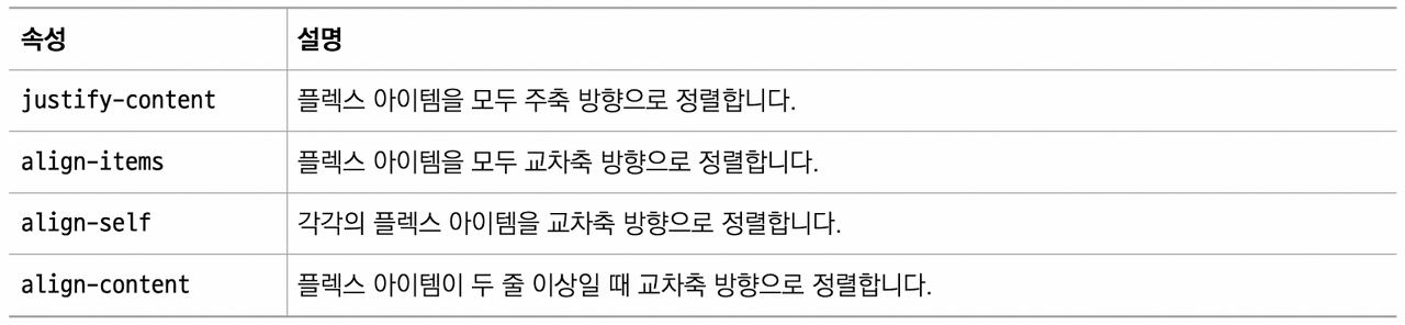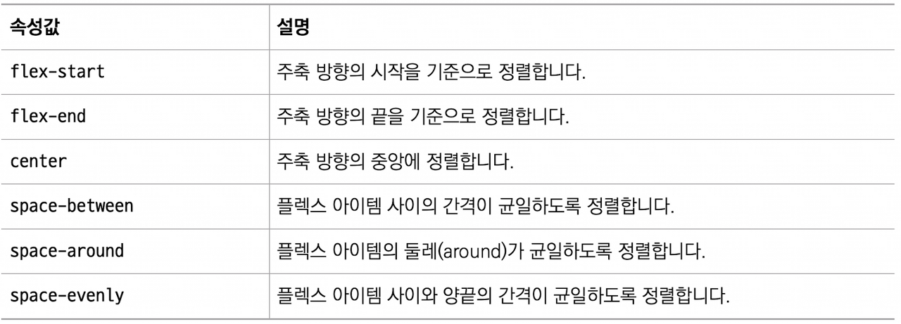 - justify-content: μ£ΌμΆμ μ λ ¬ λ°©λ²μ κ²°μ ν¨