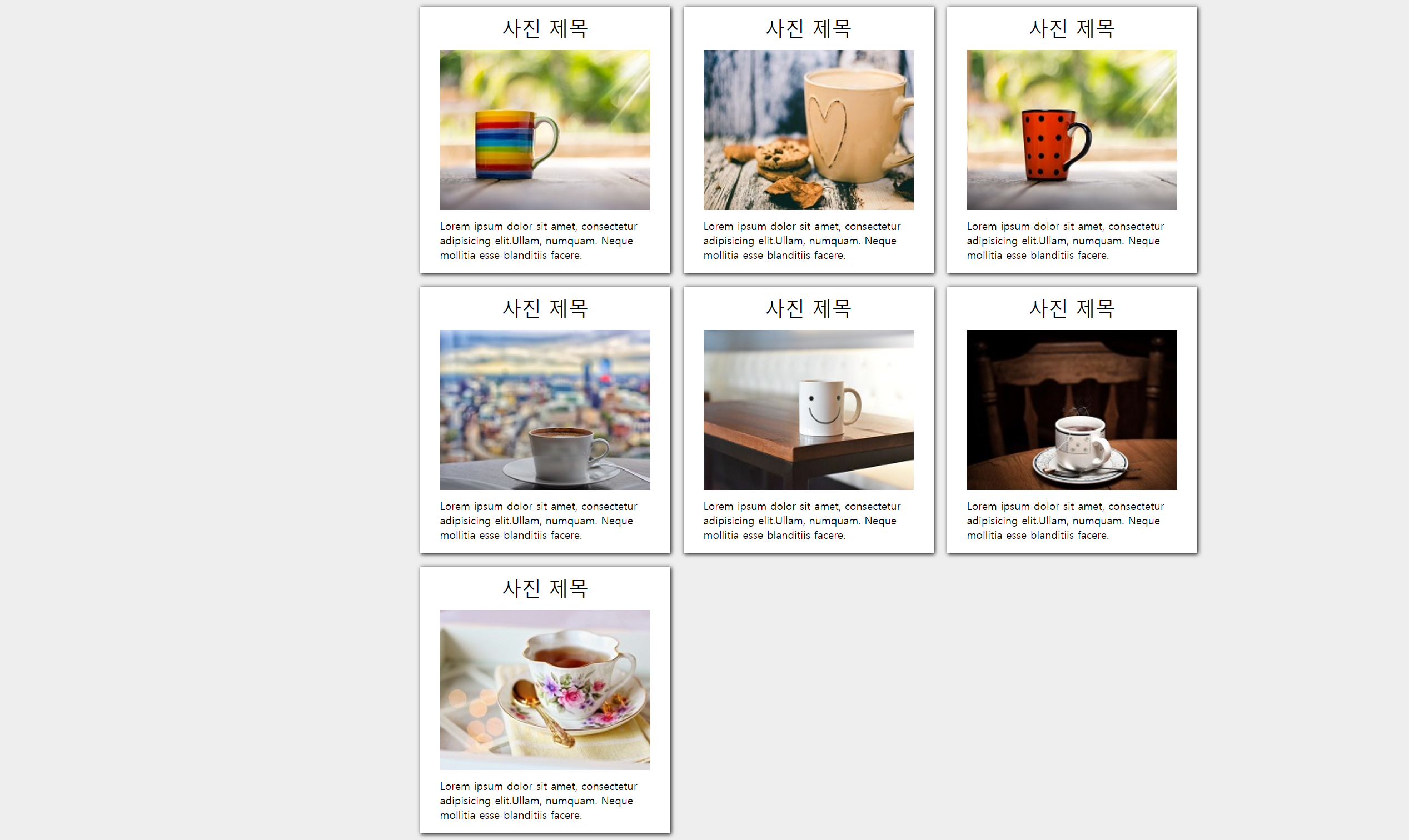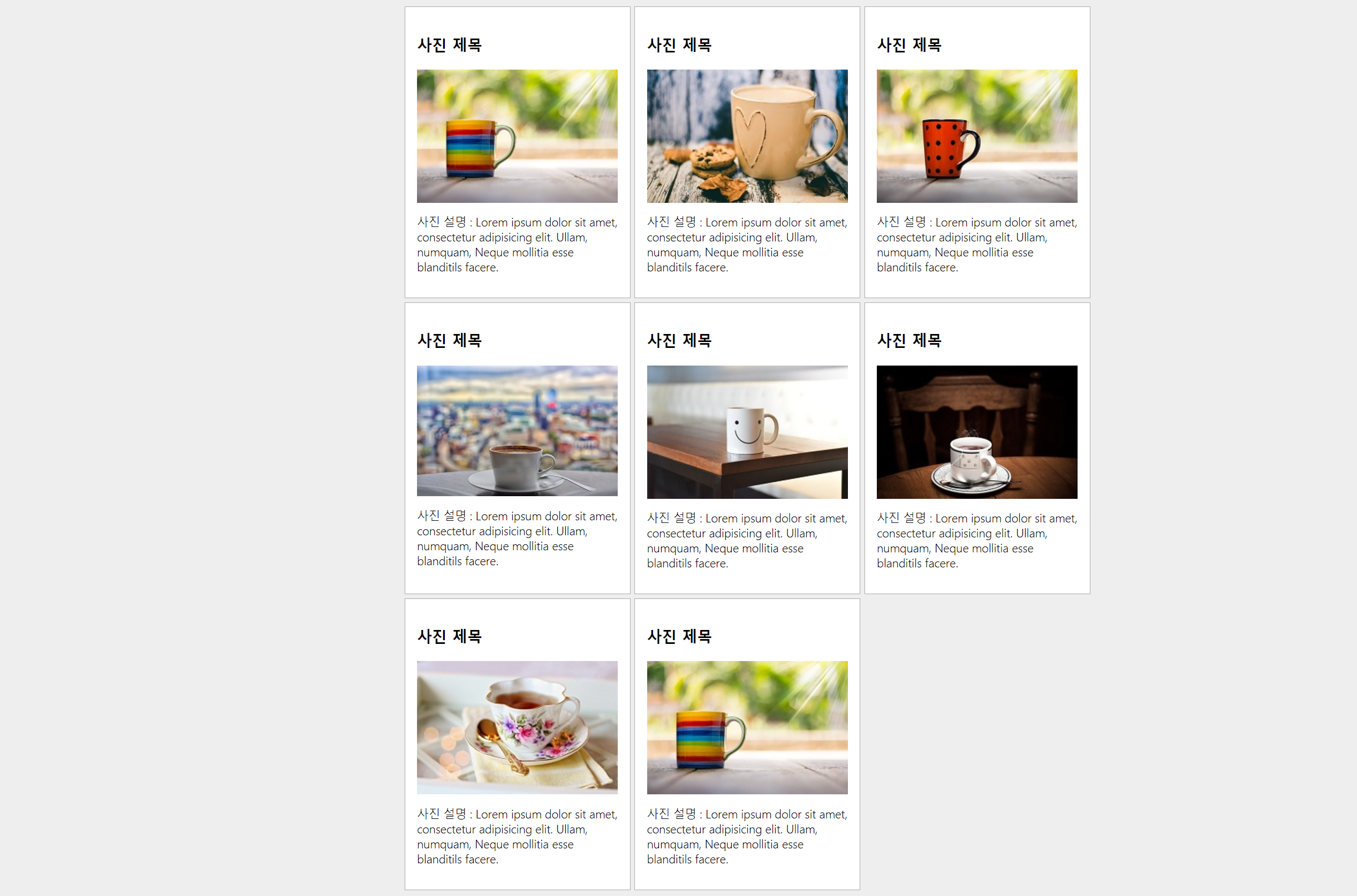 - ๋ฐ์ํ ๋์์ธ์๋ ์ ์ฉํ๊ฒ ์ฌ์ฉ๋ ์ ์์ผ๋ฉฐ, ๋ฏธ๋์ด ์ฟผ๋ฆฌ์ ํจ๊ป ์ฌ์ฉํ์ฌ ํ๋ฉด์ ํฌ๊ธฐ์ ๋ฐ๋ผ ๊ฒฉ์์ ํฌ๊ธฐ์ ์์๋ค์ ๋ฐฐ์น๋ฅผ ๋ณ๊ฒฝํ ์ ์์ต๋๋ค.