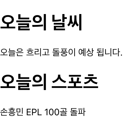 <Section title="์ค๋์ ๋ ์จ" content="์ค๋์ ํ๋ฆฌ๊ณ ๋ํ์ด ์์ ๋ฉ๋๋ค." />