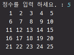 - ์์ ์ ์ n์ ๋ฐ์์ n * n ํฌ๊ธฐ์ ํ๋ ฌ์ ์ถ๋ ฅ