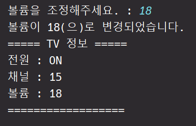 ๋ณ๊ฒฝ ํ TV ํ์ฌ ์ํ๋ getTV() ๋ฉ์๋๋ฅผ ํตํด ์ถ๋ ฅํ๋ค.