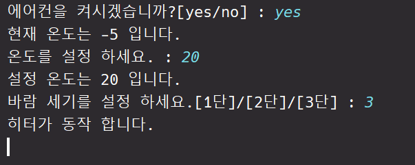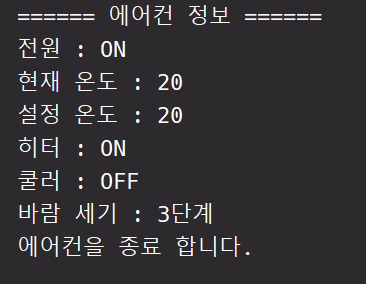 lgAirCon.setAirConState(); // ์จ๋์ ๋ฐ๋์ธ๊ธฐ๋ฅผ ์ค์ ํ๊ณ ์ค์ ์ ๋ฐ๋ผ ์ฟจ๋ฌ/ํํฐ ๊ฐ ๋ณ๊ฒฝ
